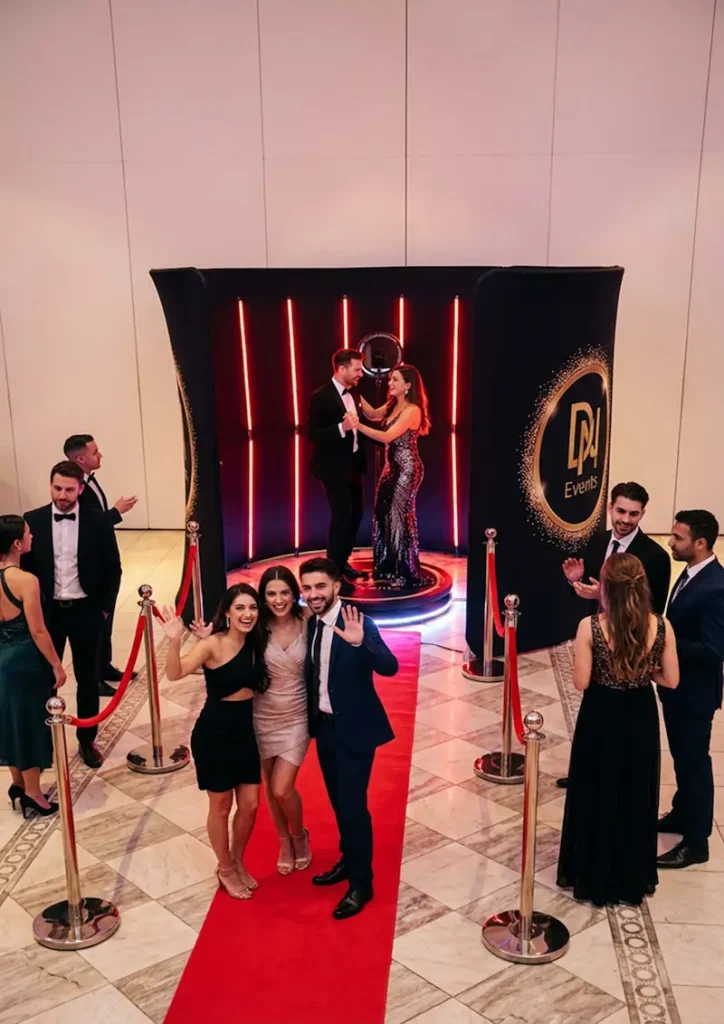 תפאורה סוחפת ברמת פרימיום, הכוללת רקע תלת-ממדי ותאורת LED מובנית. במה מעגלית לצילום סרטונים ותמונות 360 מרהיבות. אווירה קולנועית הכוללת שטיח אדום ועמודי חבל (VIP( יוקרתיים. התאמה אישית של העיצוב לצבעים ולקונספט של האירוע שלכם. מתאים לשילוב עם עמדות °360, רובוטים או עמדות צילום נייחות.