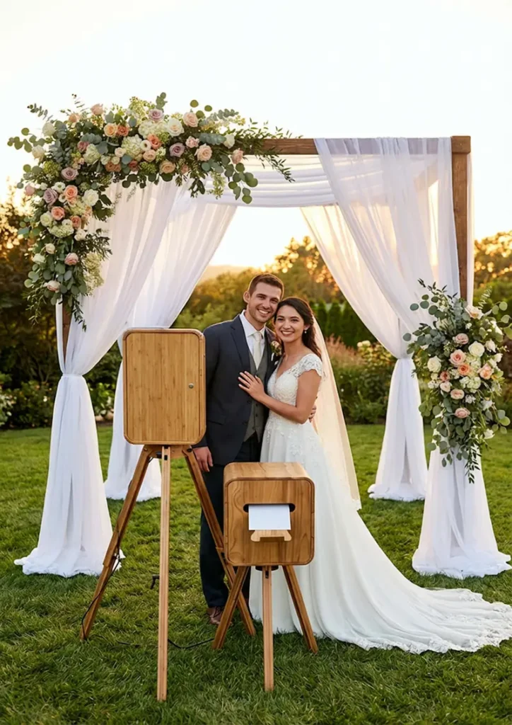 עמדת צילום מעץ בעיצוב רטרו יוקרתי, הכוללת מסך מגע ותאורת סטודיו מובנית. מצלמת HD מקצועית ופלאש מטריה לתוצאות צילום יוצאות דופן. הדפסה מיידית באיכות פרימיום. אפשרות להוספת למעלה מ002- אפקטים מבוססי בינה מלאכותית(. התאמה אישית של המסגרות, הלוגואים והקדשות אישיות. עיצוב אלגנטי המעניק אווירה חמימה ויוקרתית לאירוע. התקנה מהירה, תפעול פשוט וחוויה מושלמת לאורחים