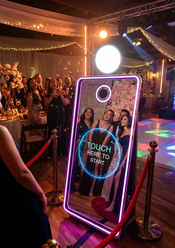 מראה אינטראקטיבית ענקית (מסך מגע) עם מסגרת תאורתBGB LED צבעונית ומרהיבה. מסך ברזולוציה גבוהה, מצלמת מובנית והפעלה פשוטה במגע. המראה כוללת אנימציות, אפקטים מיוחדים ואפשרות לחתימה אישית ישירות על גבי המסך. הדפסת תמונות מיידית באיכות פרימיום. התאמה אישית מלאה (מיתוג) של מסגרות